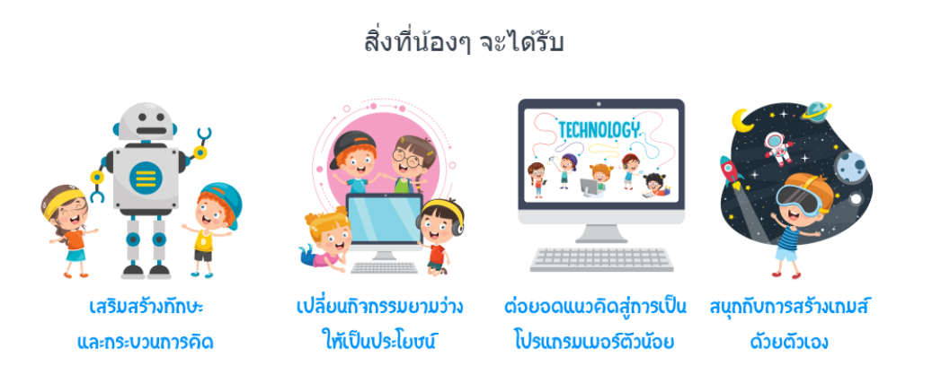 คอร์สเรียนรู้ถูกออกแบบมาเพื่อให้น้องๆ ได้เรียนรู้ผ่านการลงมือทำจริง โดยเป็นการเรียนรู้ผ่านการเขียนเกมส์เล่นเอง ทำให้น้องๆ ได้ทำความเข้าใจทีละขั้นตอน ซึ่งประกอบไปด้วย